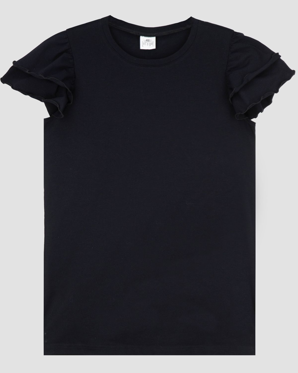 Футболка женская прямого силуэта с рукавами-крылышками. Горловина круглая, обработана воротником из основного полотна. По окату рукава-крылышек сборка, с помощью которой образуется объёмная форма. Низ рукава-крылышек обработан закруткой. Низ изделия обработан швом вподгибку. Модель рассчитана на рост 164-170см.