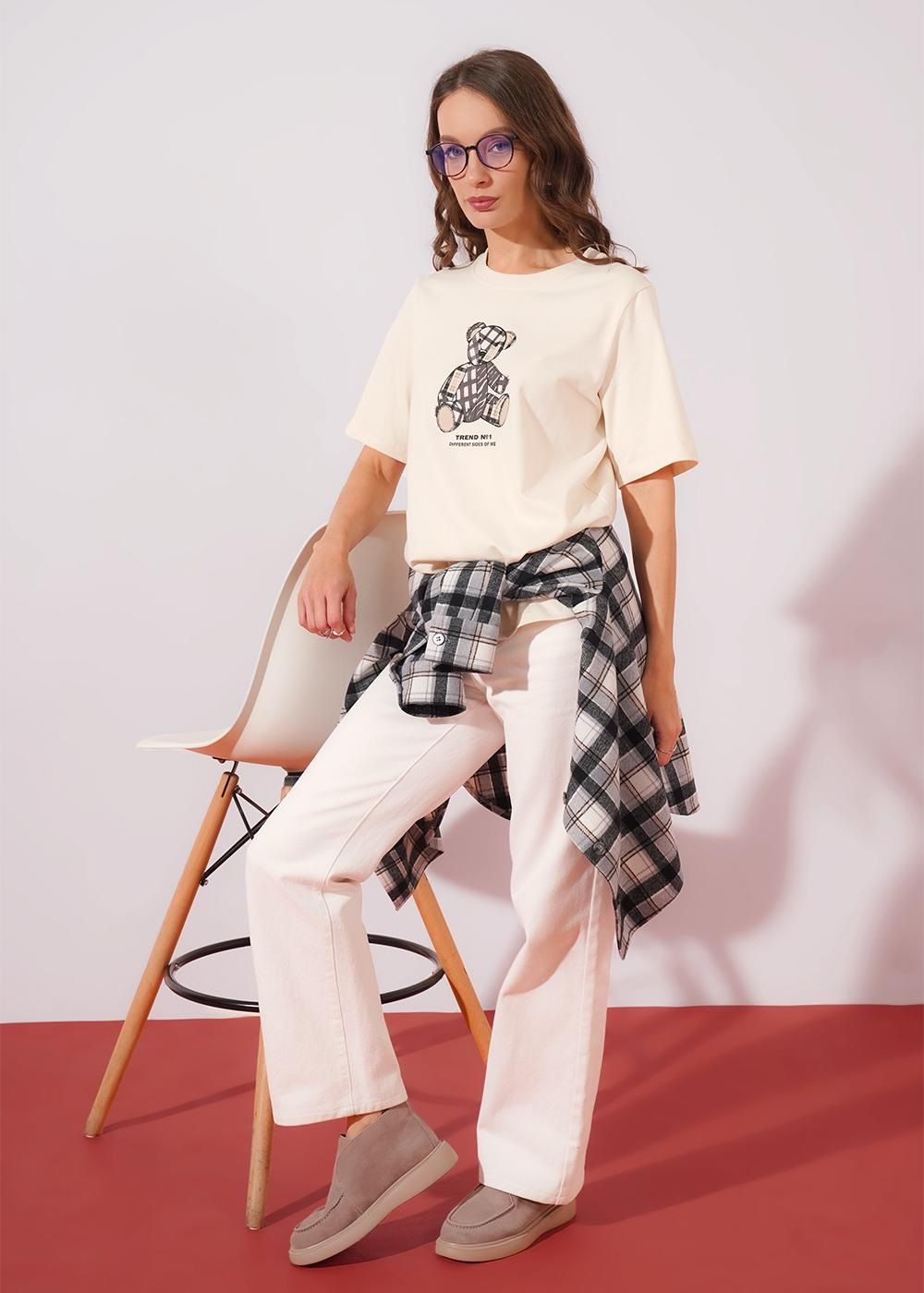 Футболка прямого кроя из хлопкового трикотажного полотна. Короткий втачной рукав. Округлая горловина с обтачкой. Спереди принт с вышивкой.