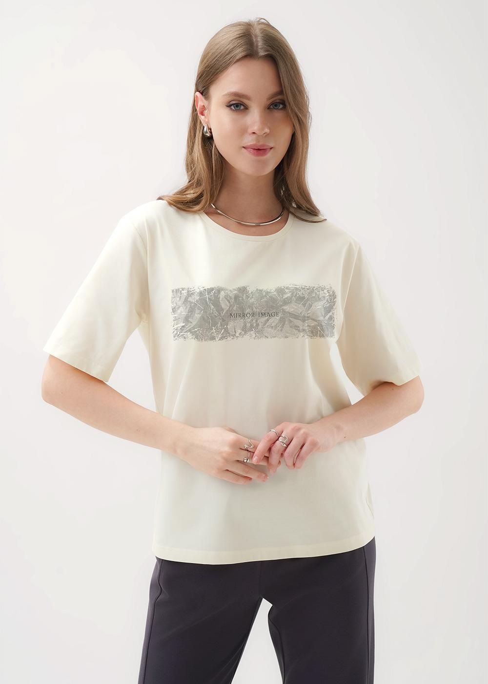 Футболка из трикотажного полотна прямого кроя. Короткий втачной рукав. Округлая горловина с обтачкой. Спереди принт с фольгой..