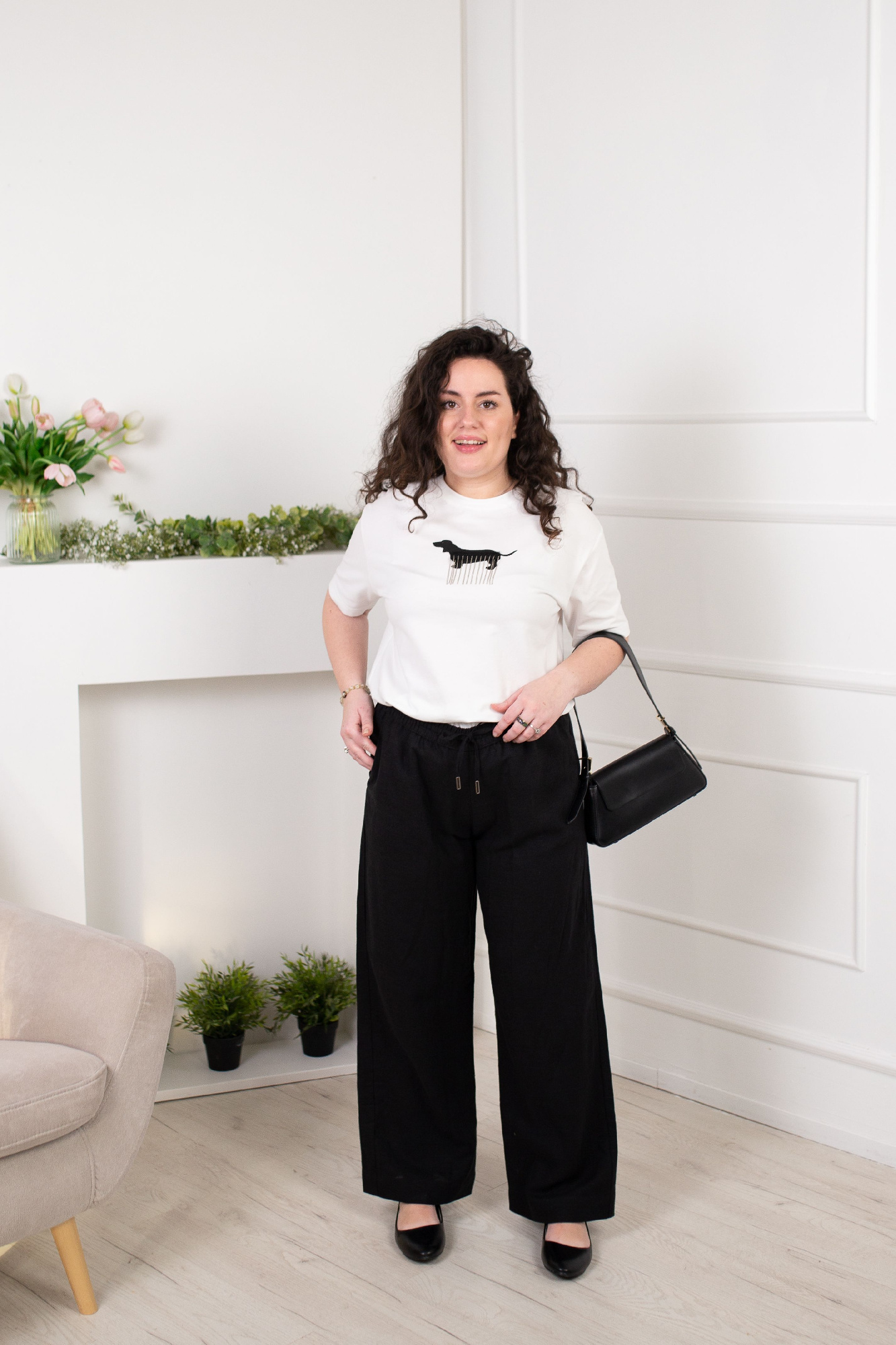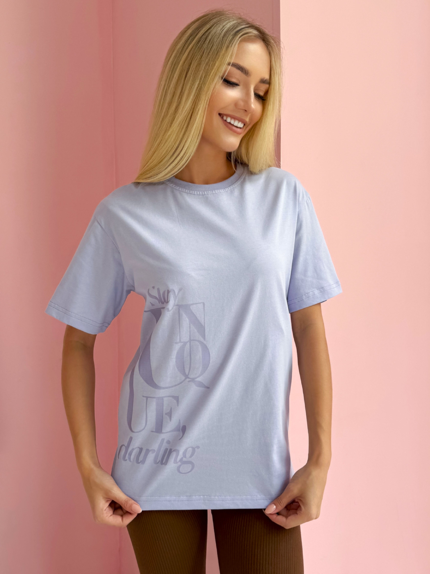 Футболка оверсайз из хлопкового трикотажного полотна. Короткий спущенный рукав. Округлая горловина с обтачкой из рибаны. По спинке средний шов. По переду термостразы.