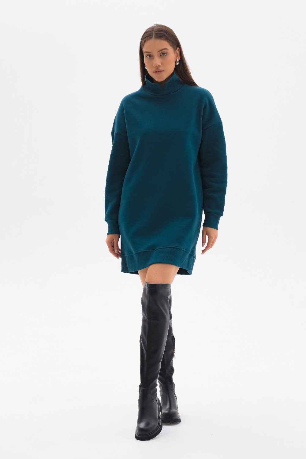 Платье, длиной мини из мягкого шелковистого футера с начёсом с воротником-стойка, спущенной линией плеч и объемными длинными рукавами на манжете. Можно сочетать как с брюками, так и носить отдельно. В нём вы всегда будете выделяться, ведь красота в простоте. Все эти детали делают эту модель особенной привлекательной, выглядит очень эффектно и стильно.