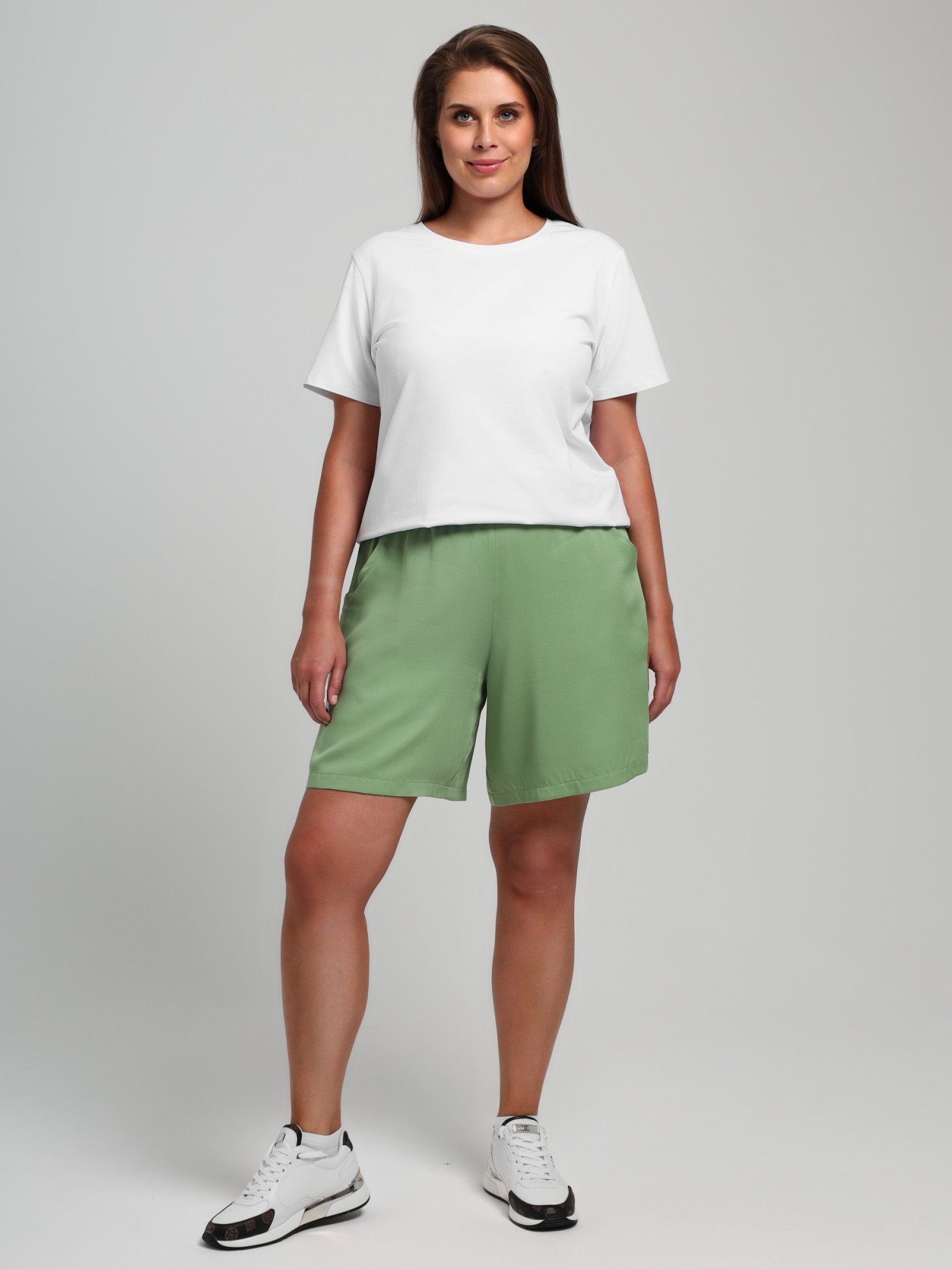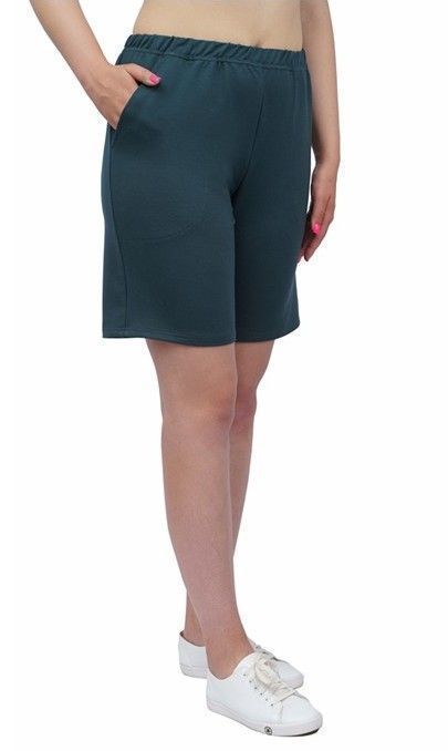 Шорты женские из гладкокрашеного тканого штапельного полотна, свободные, с карманами в боковых швах, на притачном поясе с эластичной тесьмой внутри. Средний шов передних половин обработан имитацией «гульфика»,